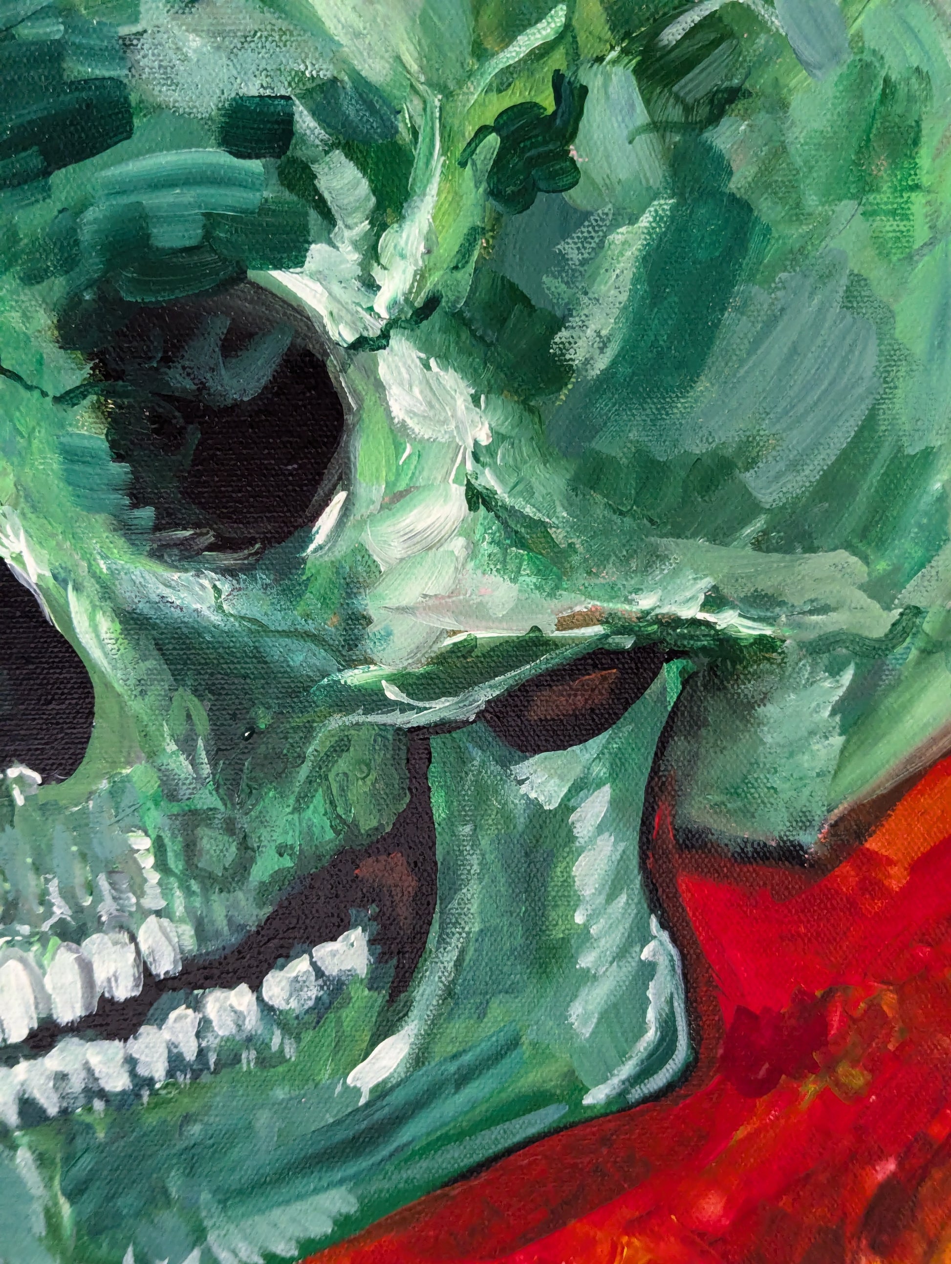 Bitterness, anger, jealousy, the inability to let go and move past these emotions can easily lead one to an end of their own making. The colours used are intended to convey jealousy and destruction.